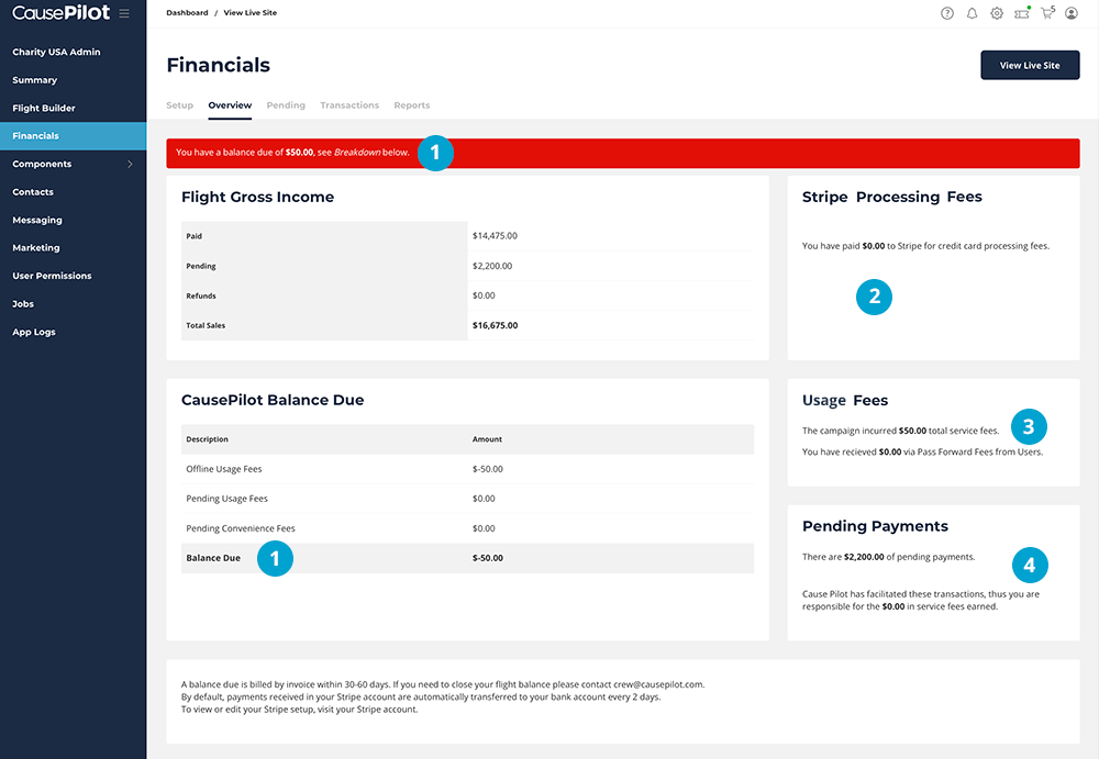 Your CausePilot software will track pending payments as this affects your usage fees and balance due. Completing all transactions will bring this number to zero and potentially lower your balance due.
