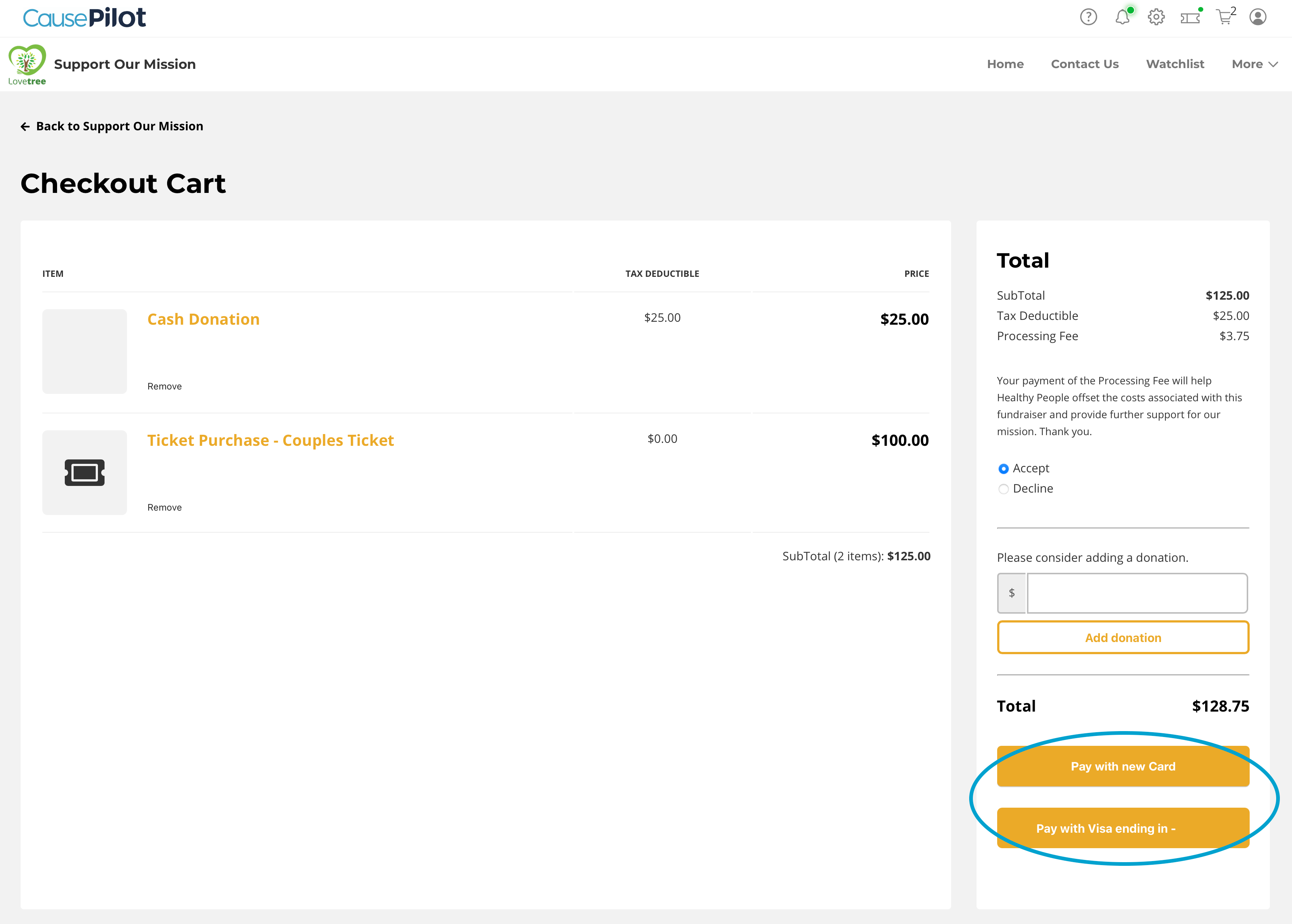 These pending payments will appear in each participant's checkout cart. They can submit payment themselves or you can manage the process in the management area.