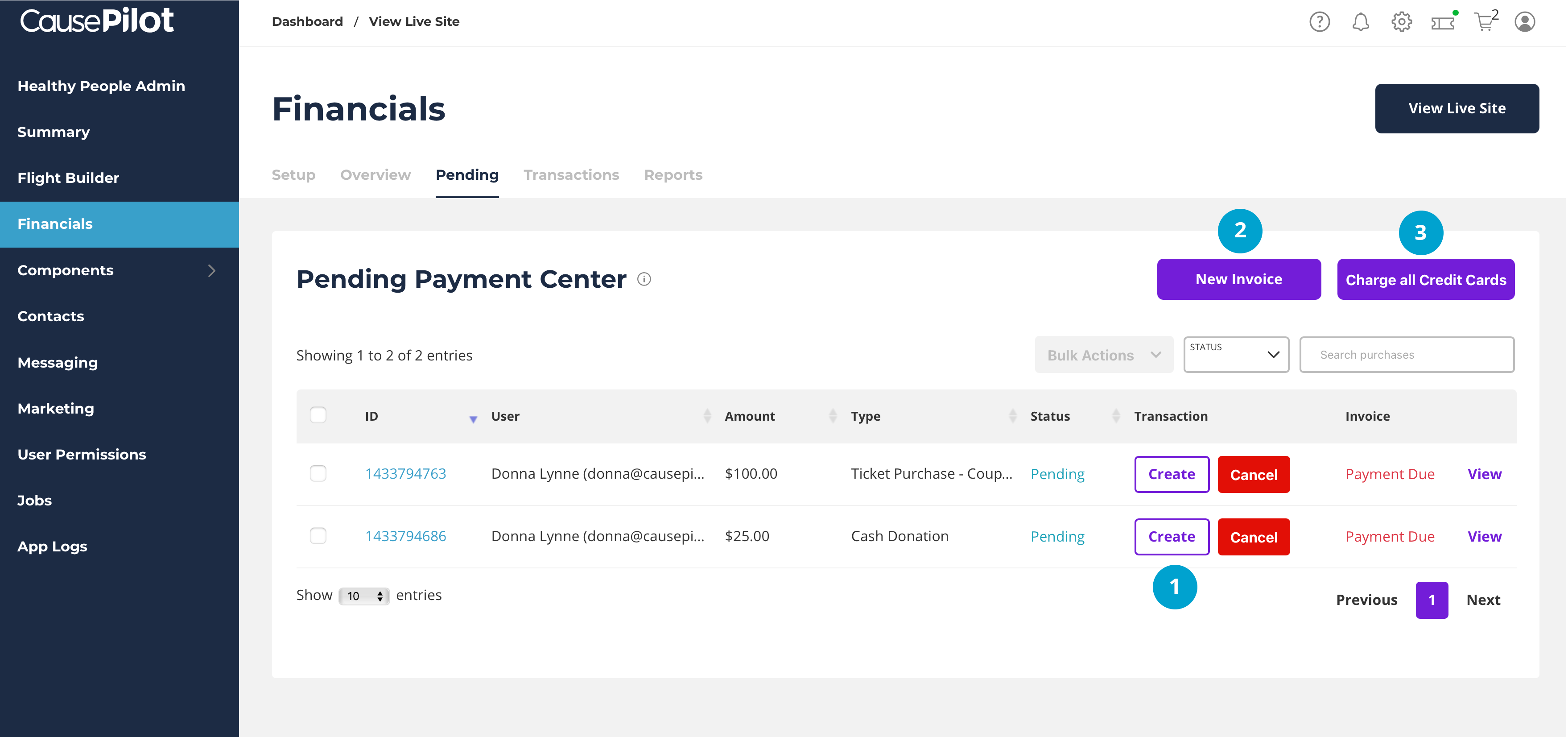 The Financials Pending tab displays a table of all pending transactions. These are the participants who currently owe your Organization a payment.