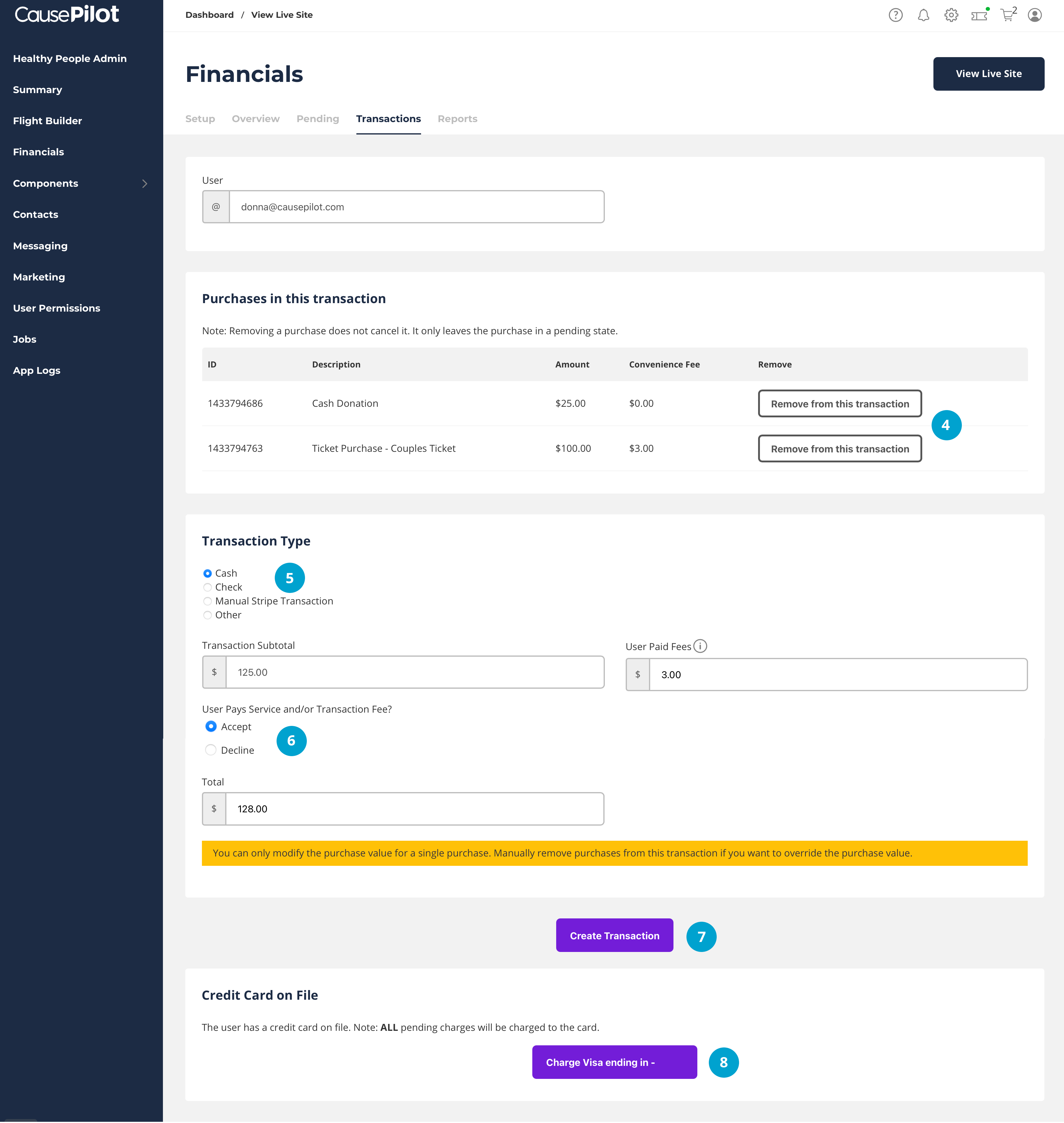 TIP: On occasion, you may have a credit card that does not go through when you click "Charge all Credit Cards". In some instances, if you create the transaction manually, and charge the card on file, it will go through. If neither of these methods work, the user will need to either contact their credit card company or provide another form of payment.