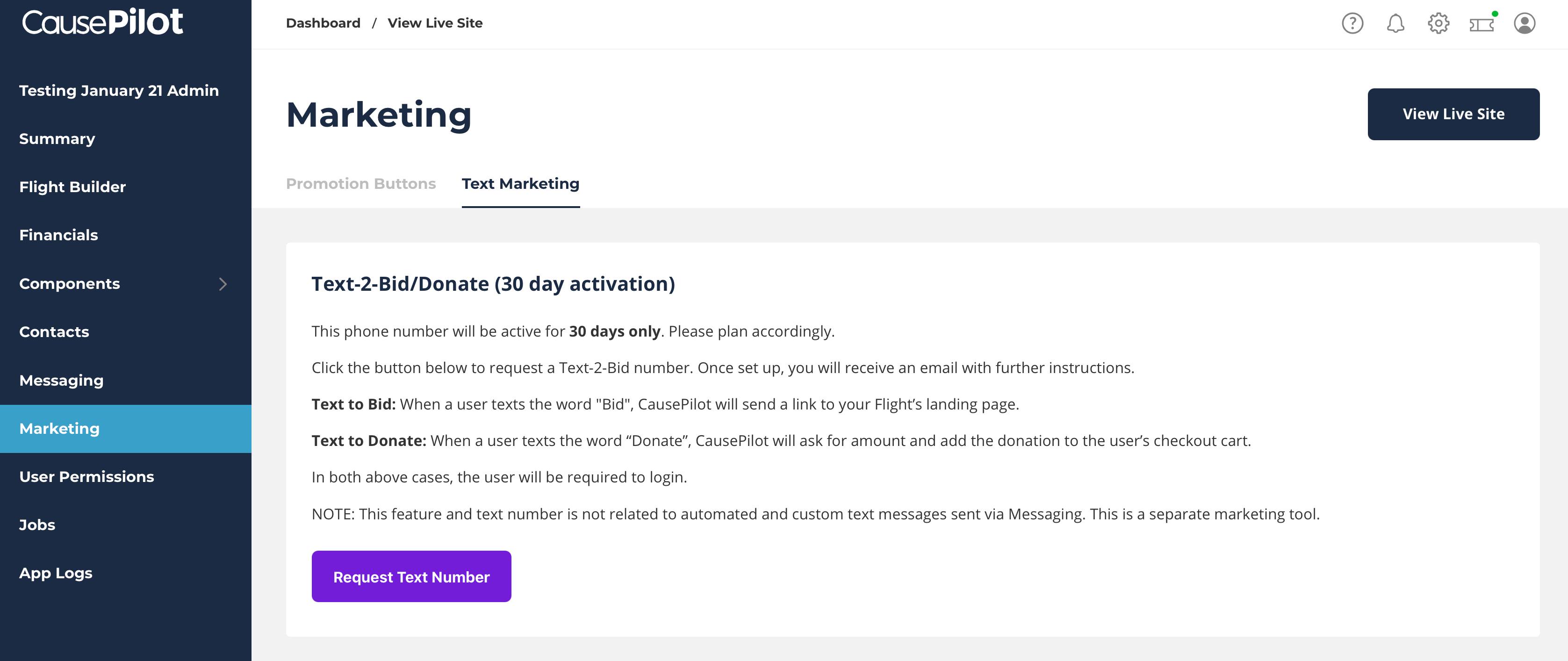 NOTE: Text Marketing is a separate process from automated text messages and custom text messages. There is no time limit on sending automated and custom texts. However, this feature (Text Marketing) is no extra charge to you but there is an additional monthly cost to CausePilot. This is why there is a 30 day limit.