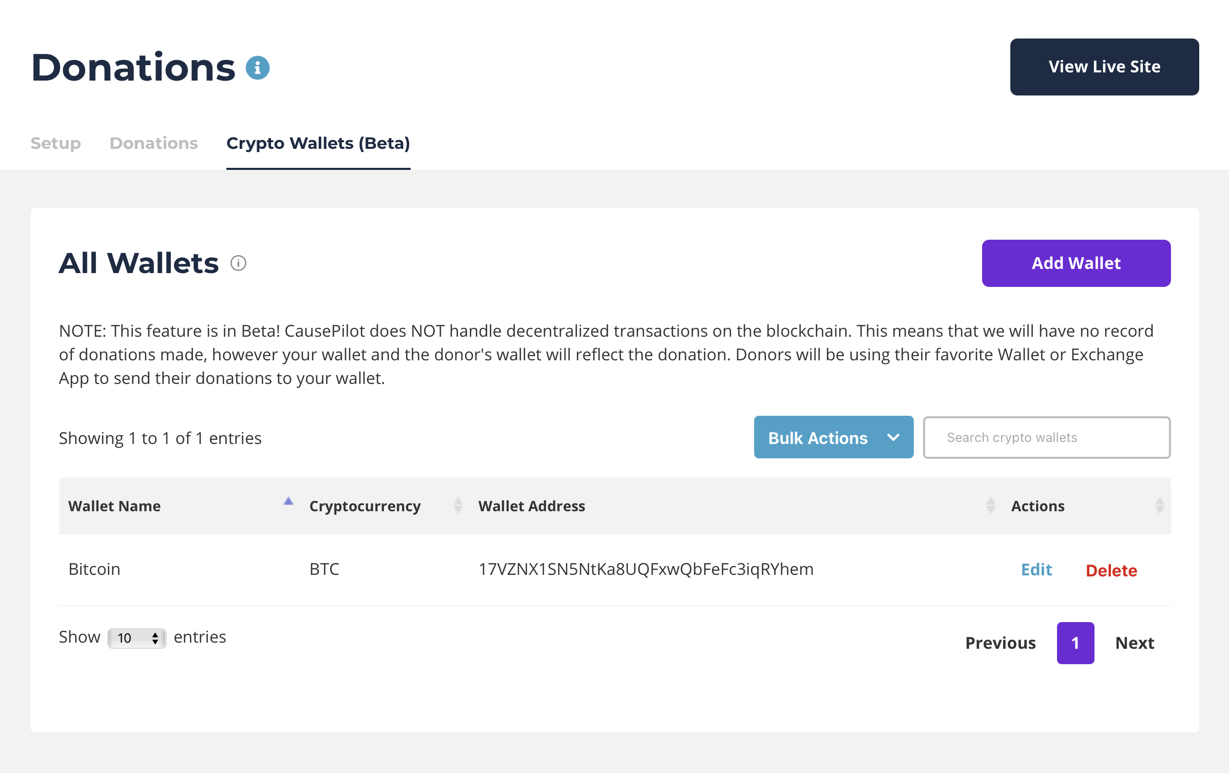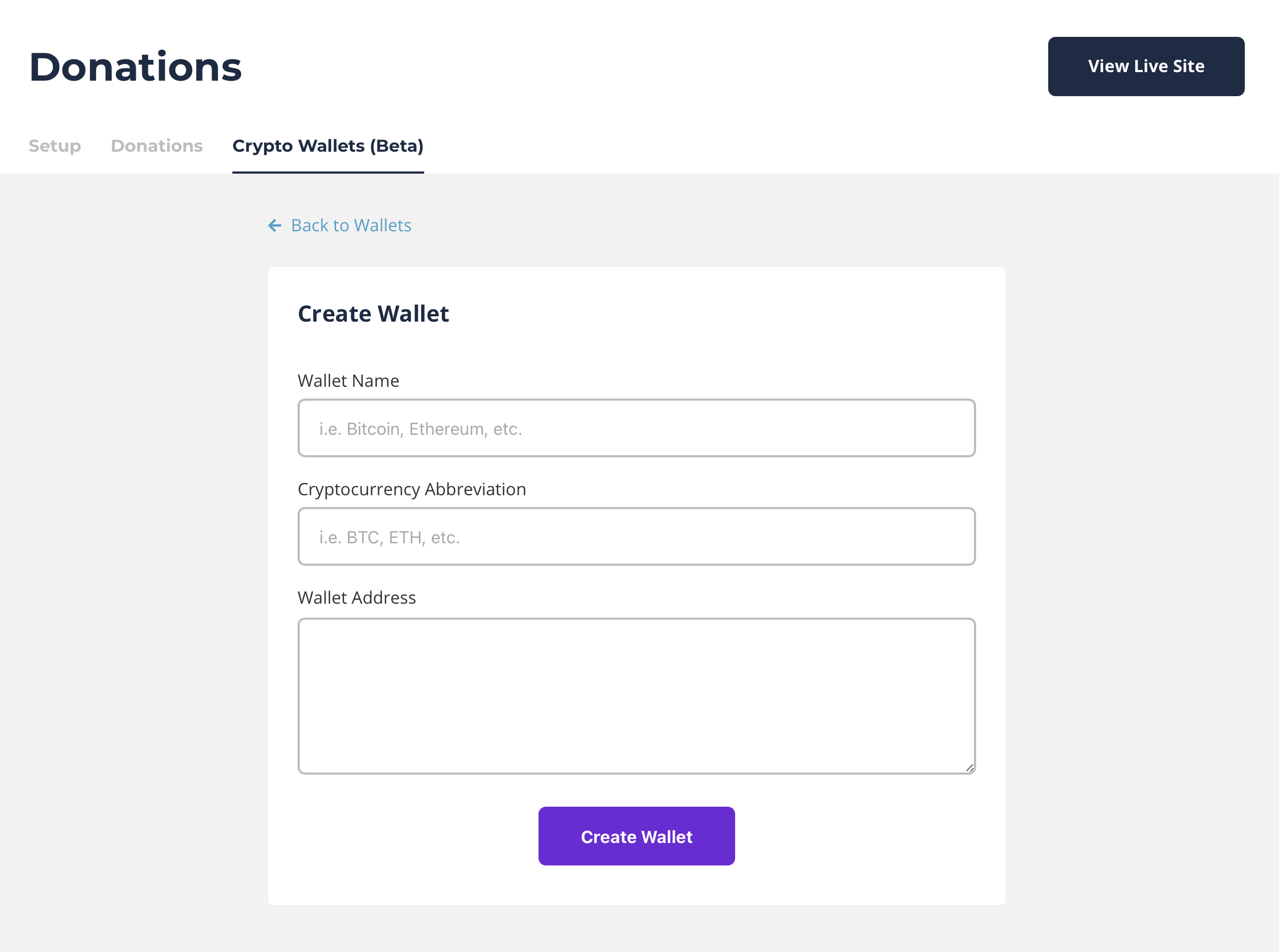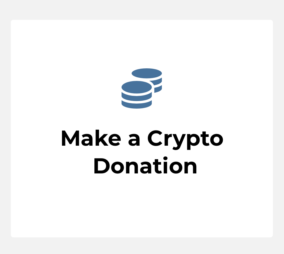 As of this writing, our Crypto donations feature is very simple. We provide you a way to add a button offering users a way to donate via Crypto, and a way for you to share the address of your Crypto wallet so they can donate to it.
