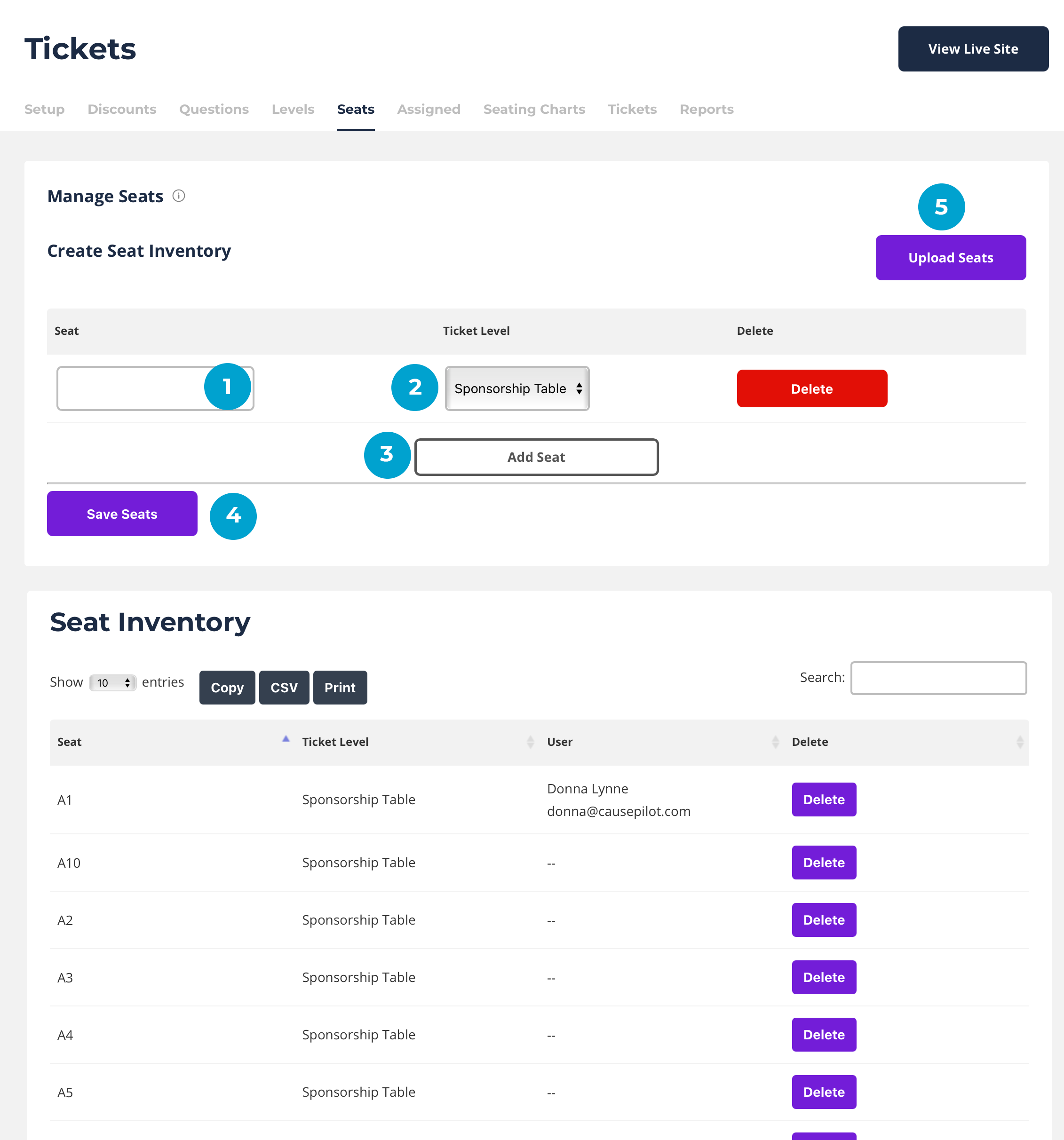 5. Upload Seats. What is described above is a way to enter your seat inventory one at a time. Another way to add your seat inventory is to create a spreadsheet and upload them all at once. NOTE: Either way the seats must be created/typed - in the spreadsheet or in CausePilot - but you can choose which way is easier for you.