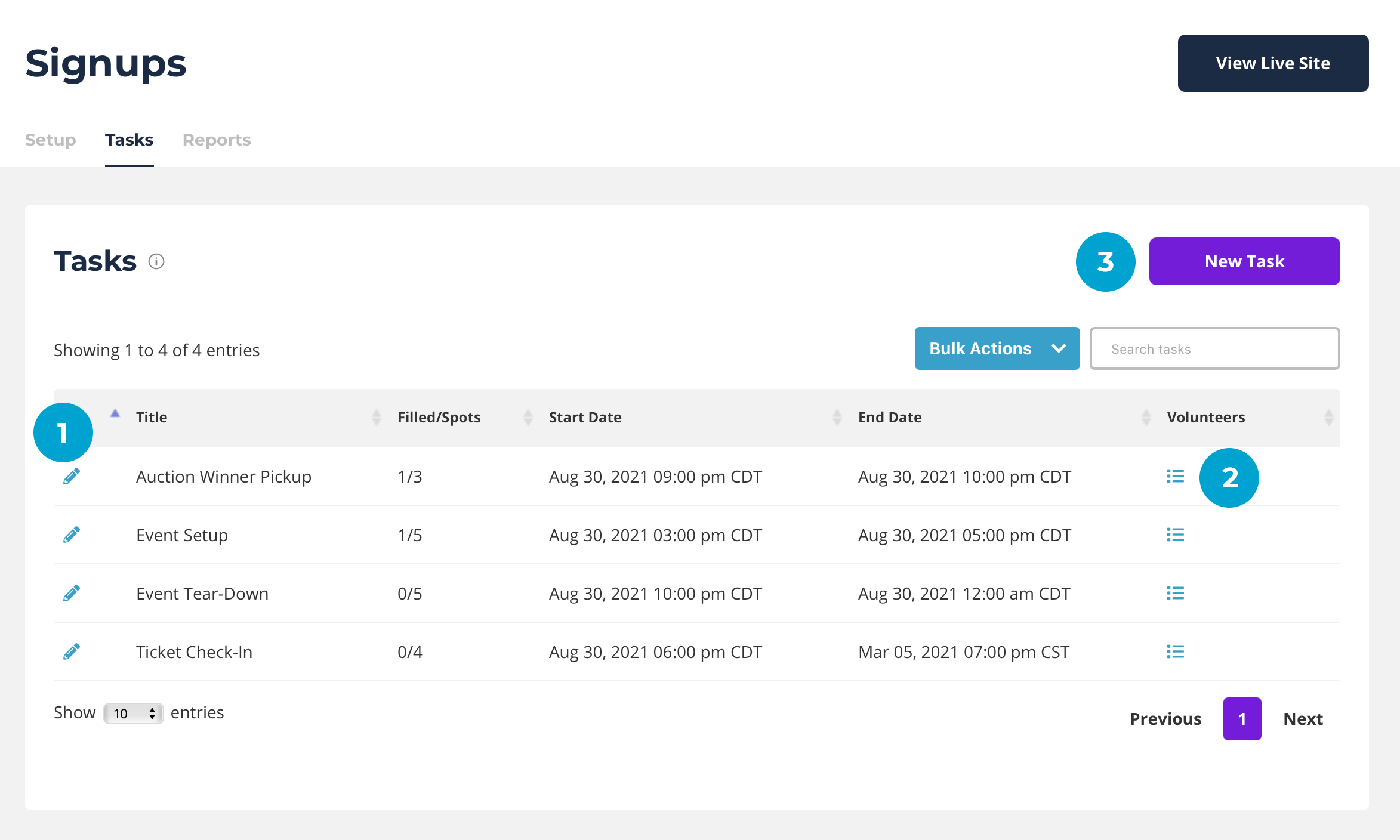 1. Edit. Click the edit icon (pencil) to open an existing task to make changes.