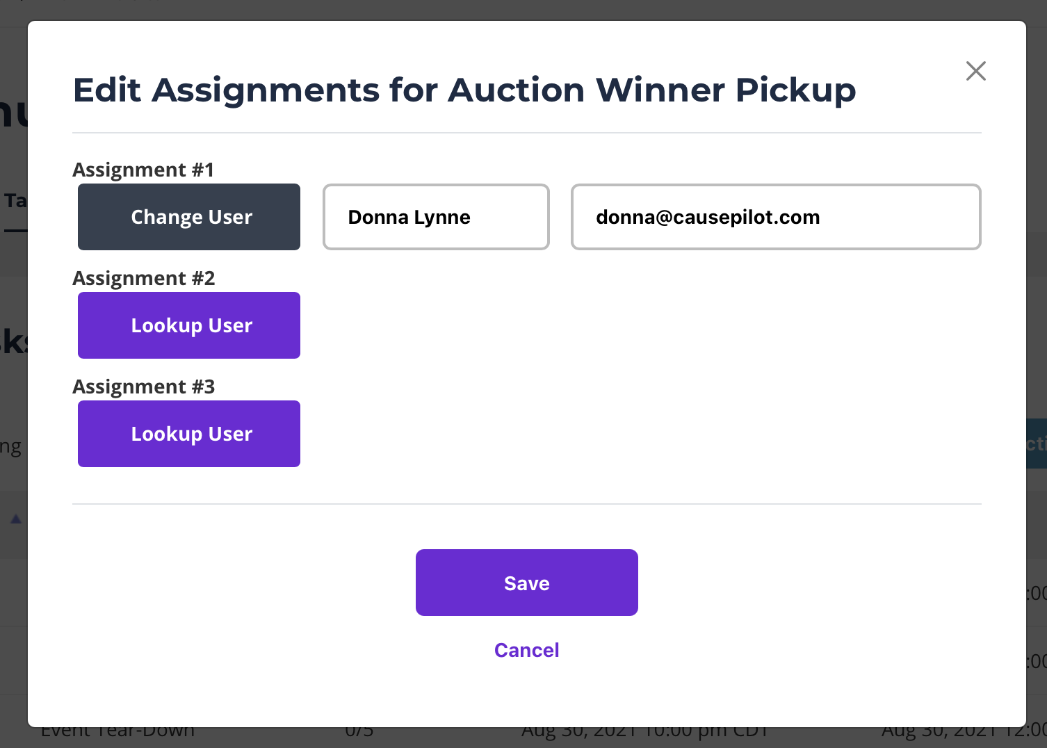 2. Volunteers. Click the list icon to open and view volunteers who have signed up for the task. Here you can make changes. Click "Change User" or "Lookup User" to select or add a new Contact for the task assignment.