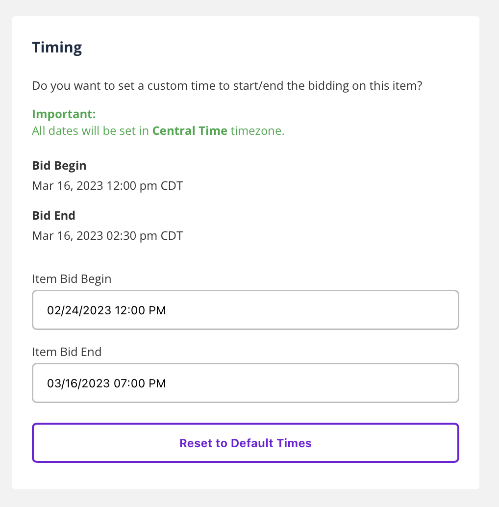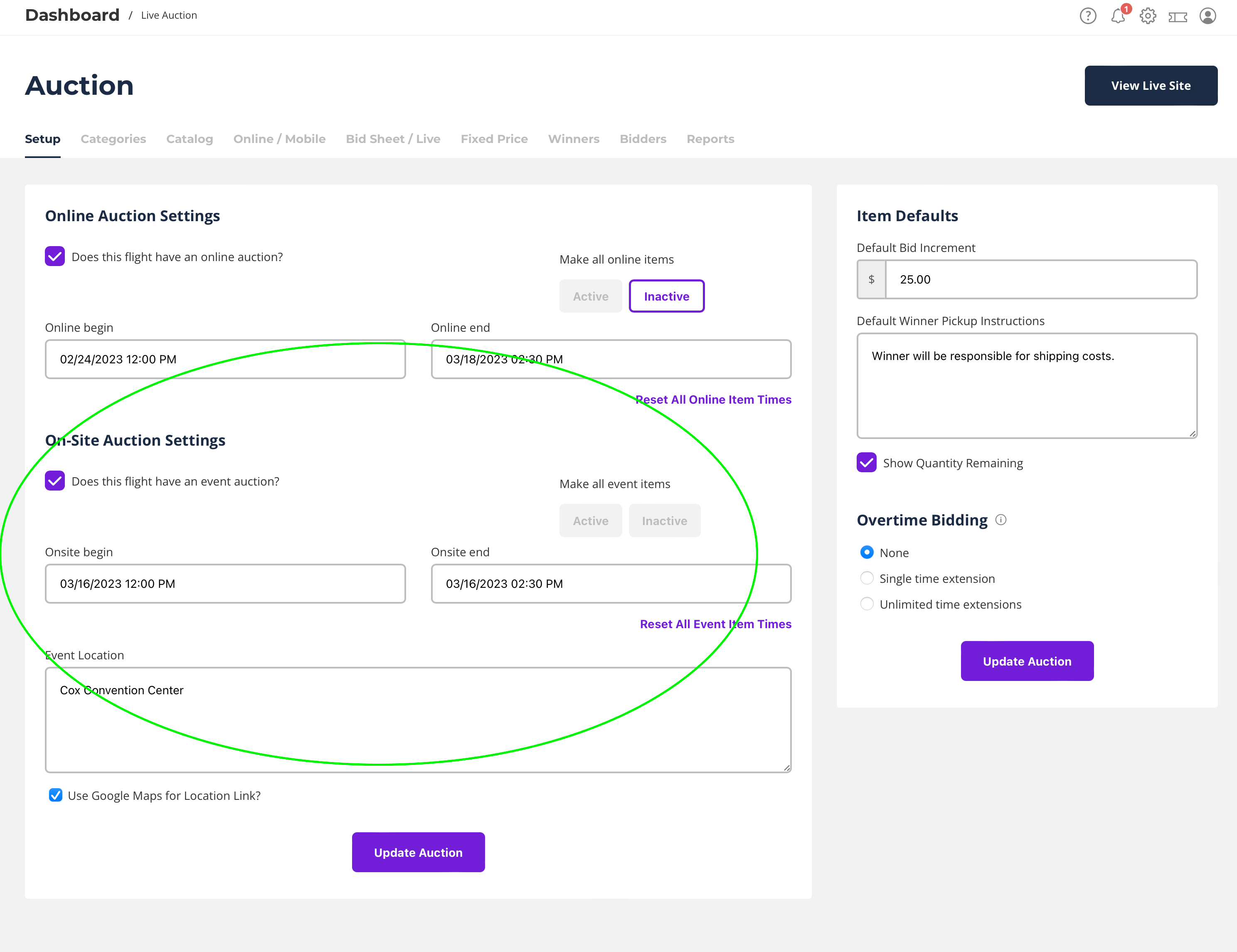 Also on the item detail page, make sure you have set the timing correctly on these items. When online bidding can begin and when the actual live auction will end. Note: Once you move to a bid sheet/live auction, final winners will be entered manually.