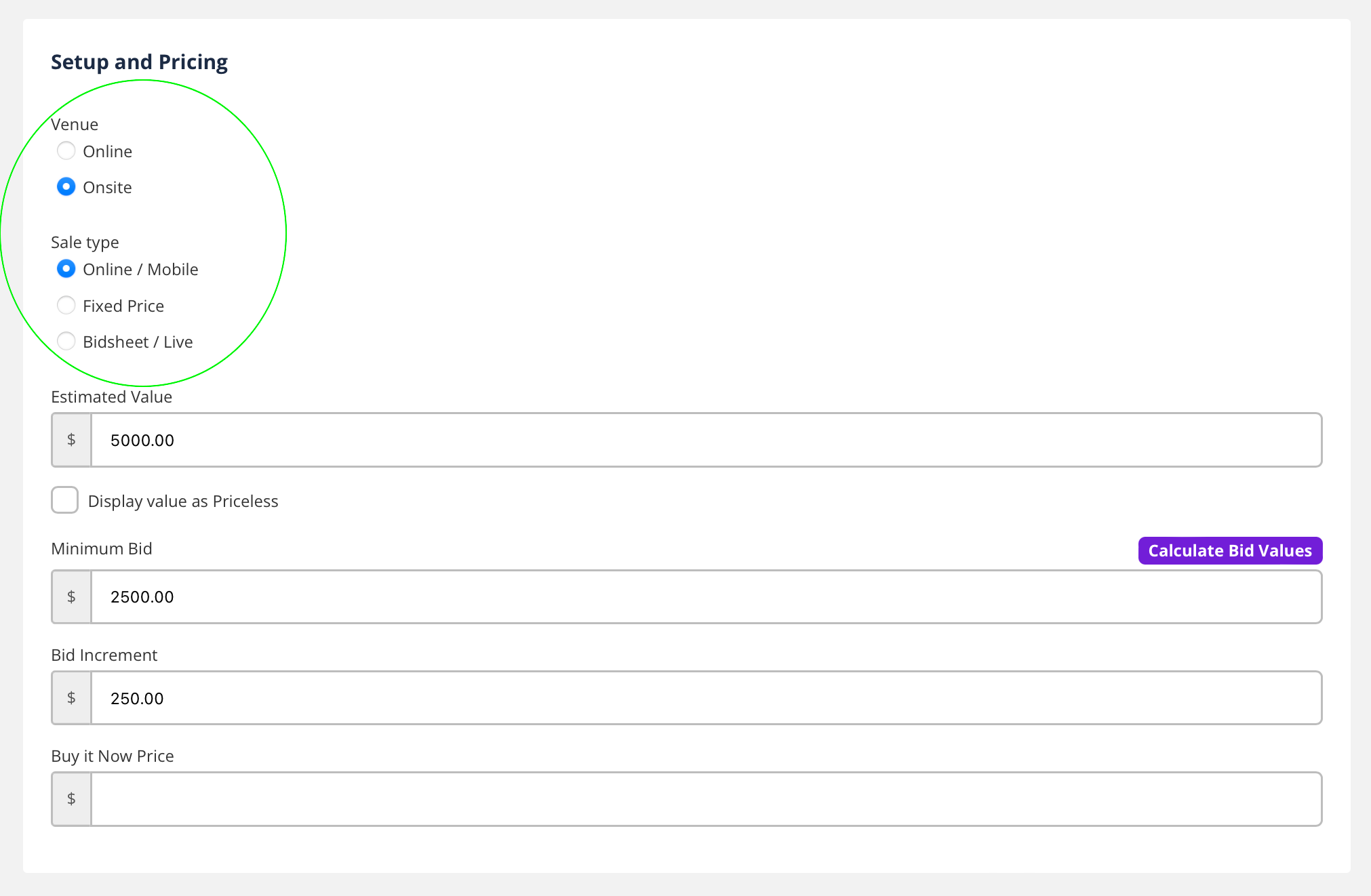 IMPORTANT: If you have set the venue for items as ONLINE you will not have the Sale Type option Bid Sheet/Live.