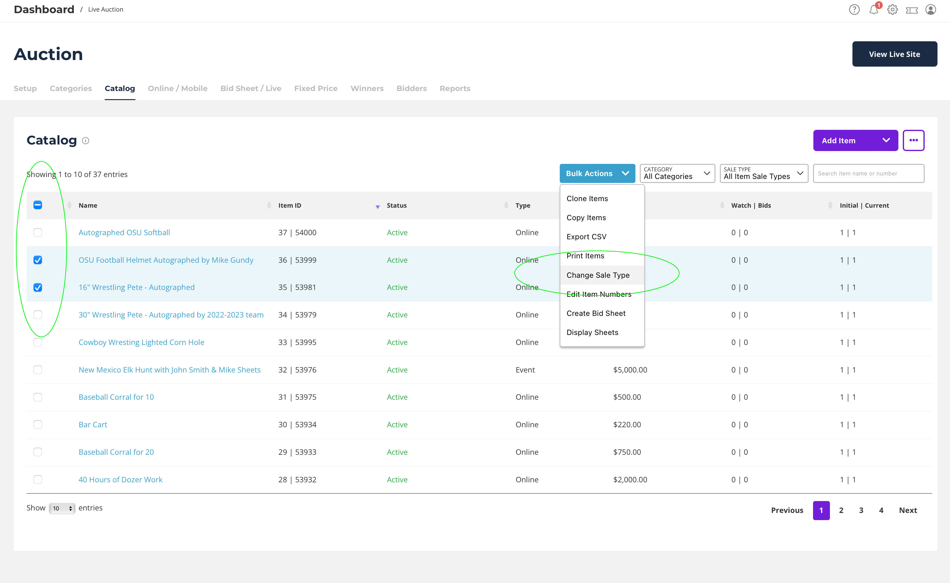 Check the items that you want to change from Online/Mobile bidding to Bid Sheet/Live Bidding.