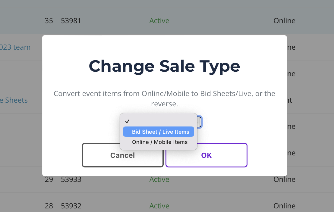A modal will open that allows you to choose Bid Sheet/Live for all of the items you've checked.
